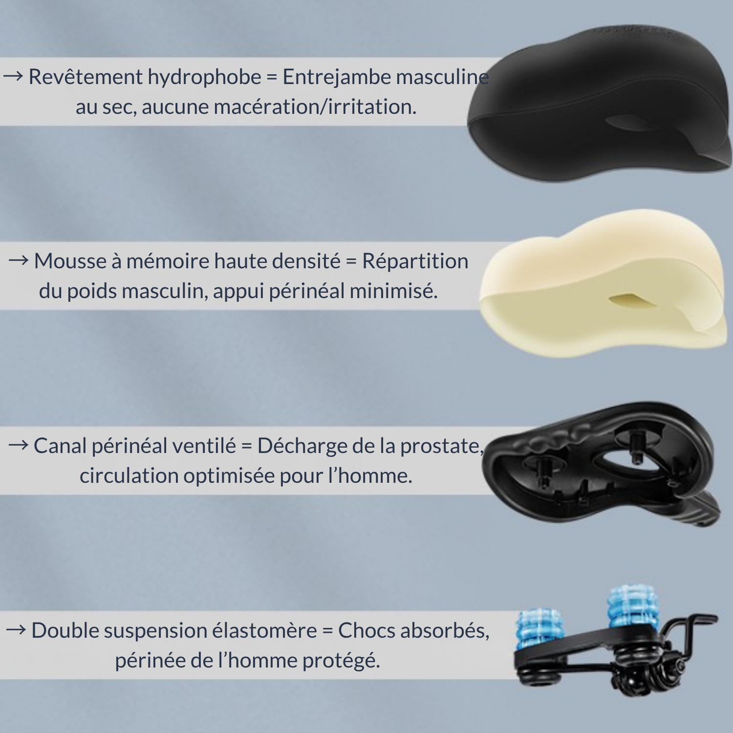 La SelleNuage® CONFORT+ libère la pression sur la zone périnéale et préserve la circulation sanguine essentielle à votre vitalité masculine.