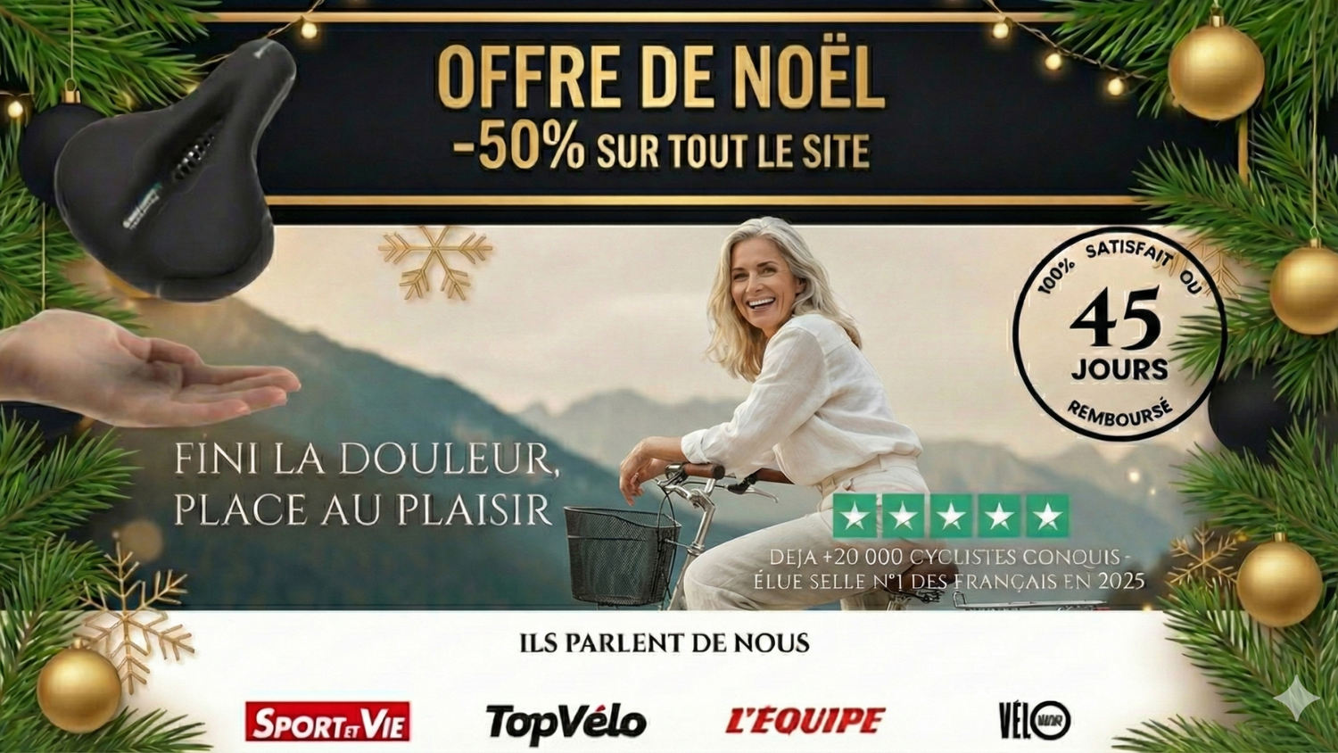 Testez la SelleNuage®, spécialement conçue pour le confort des femmes, sans aucun risque grâce à notre garantie satisfaite ou remboursée pendant 45 jours.
