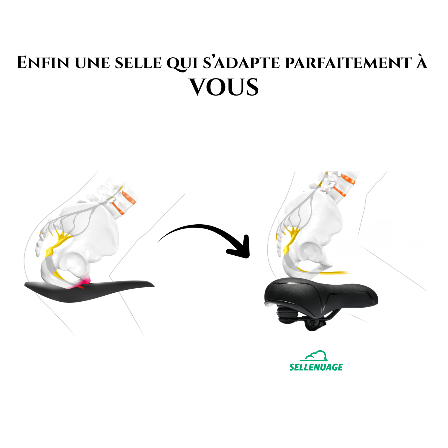 La SelleNuage® FEMME EXTRA CONFORT+ est plus large, plus stable et équipée d’une mousse révolutionnaire à haute élasticité, spécialement conçue pour la morphologie féminine.