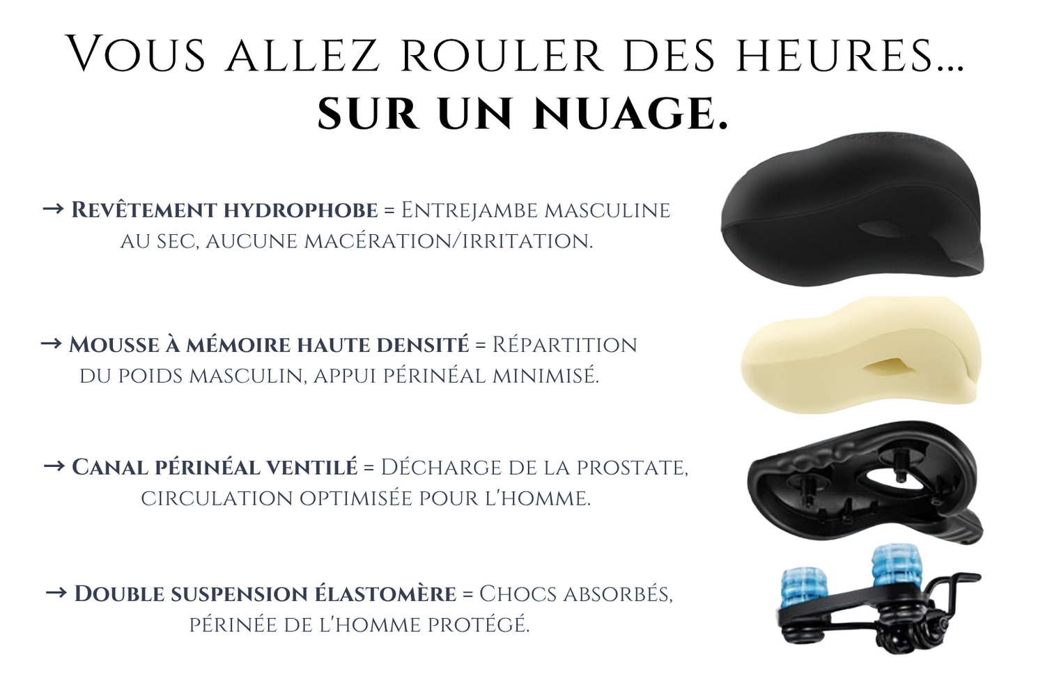 Testez la selle SelleNuage®, spécialement conçue pour le confort des hommes, sans aucun risque grâce à notre garantie satisfaite ou remboursée pendant 45 jours.