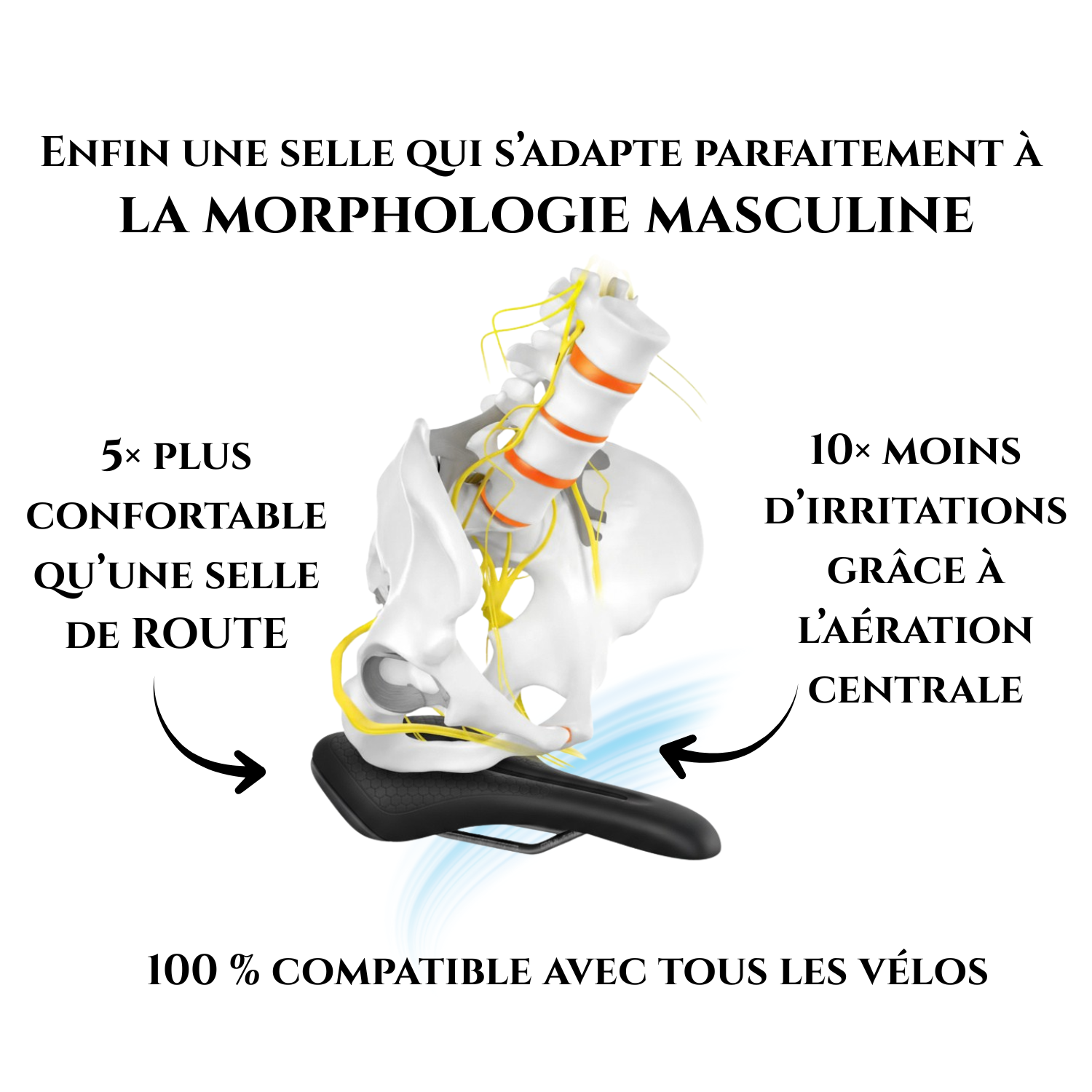 Lorsqu’un homme s’assoit sur une selle classique trop étroite ou mal conçue, une forte pression s’exerce sur la zone périnéale - c’est-à-dire entre les testicules et l’anus.