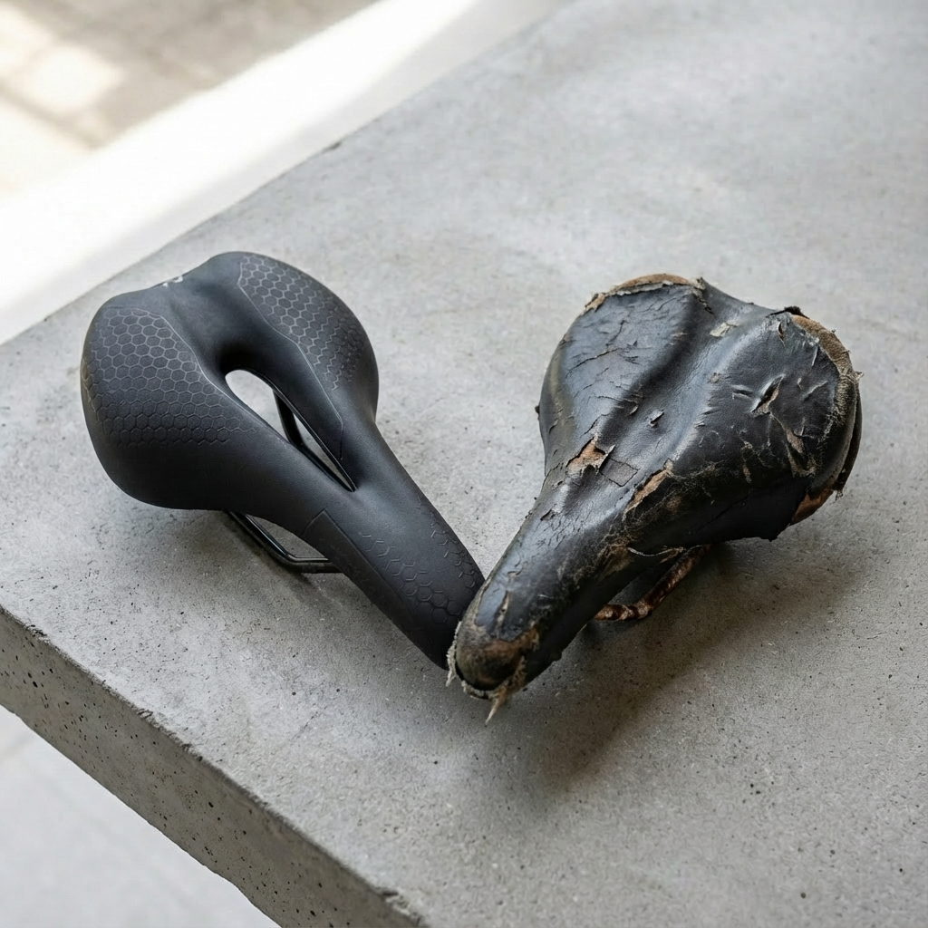 J'ai passé 15 ans à m'abîmer la santé sur l'horreur que vous voyez à droite. Je suis resté bloqué sur une vieille idée reçue : je pensais que pour avoir du confort, une selle devait être grosse et molle. Du coup, je regardais les selles modernes comme celle de gauche avec méfiance. À plus de 50 ans, je me disais que ces trucs fins et légers, c'était bon pour les jeunes compétiteurs qui acceptent de souffrir, pas pour moi qui veux juste enchainer les kilomètres sans douleur.